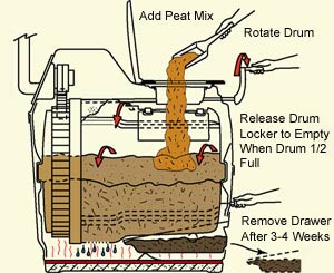 periodically into finishing drawer for removal. Better than a flush toilet—odors