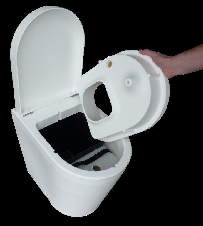 bottom of the bowl dumping water down sewer or into composter. Includes seat