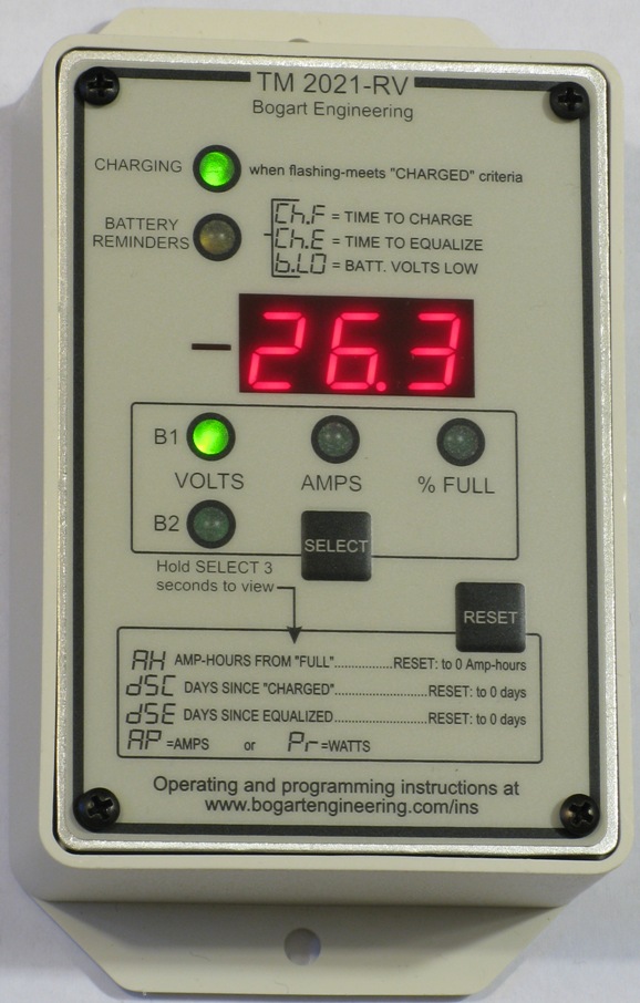 Monitors: Volts - Amps - Watts - Amp Hours - Percent Full
