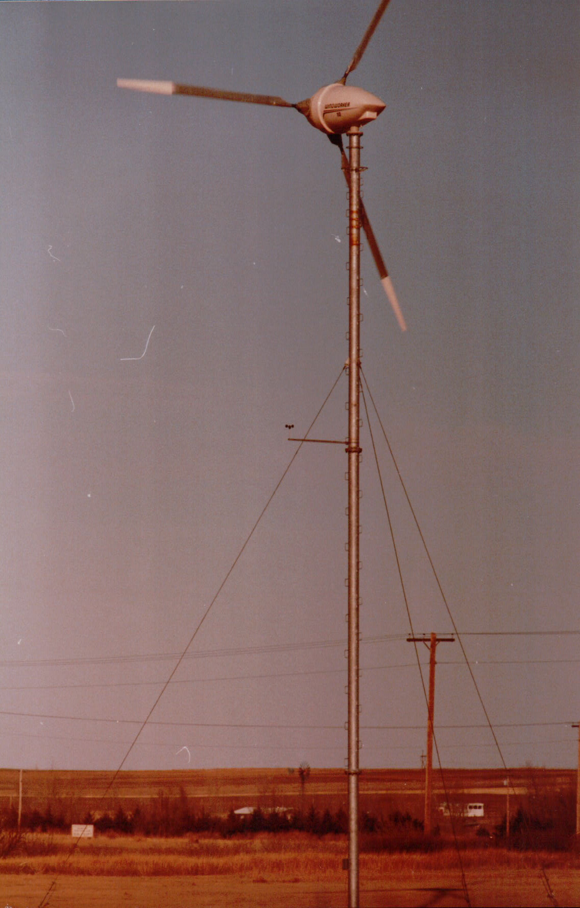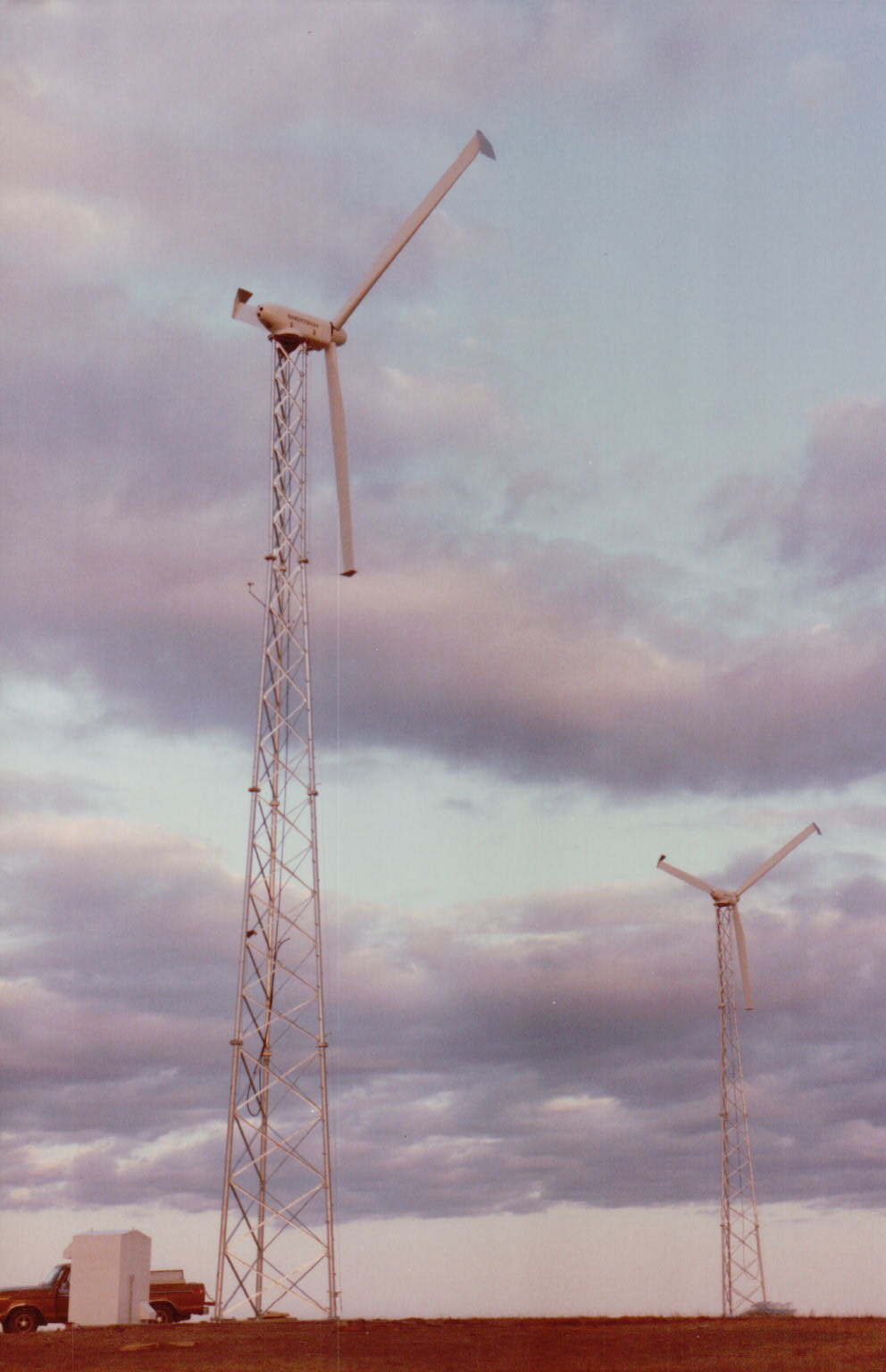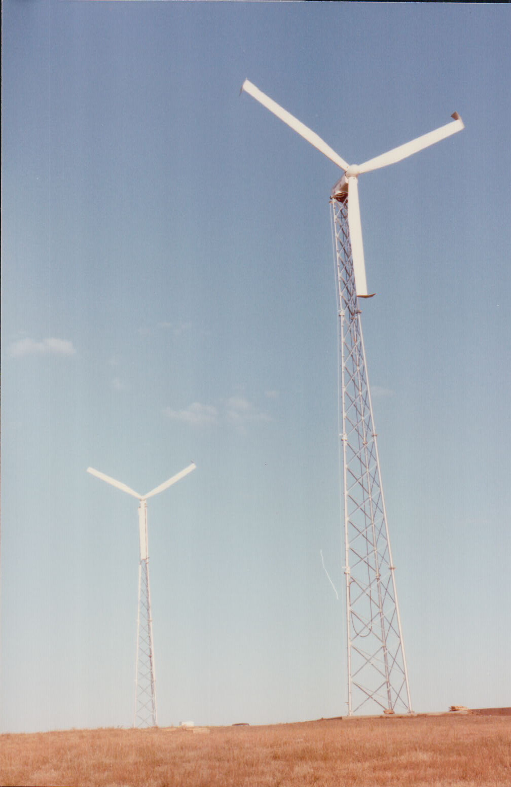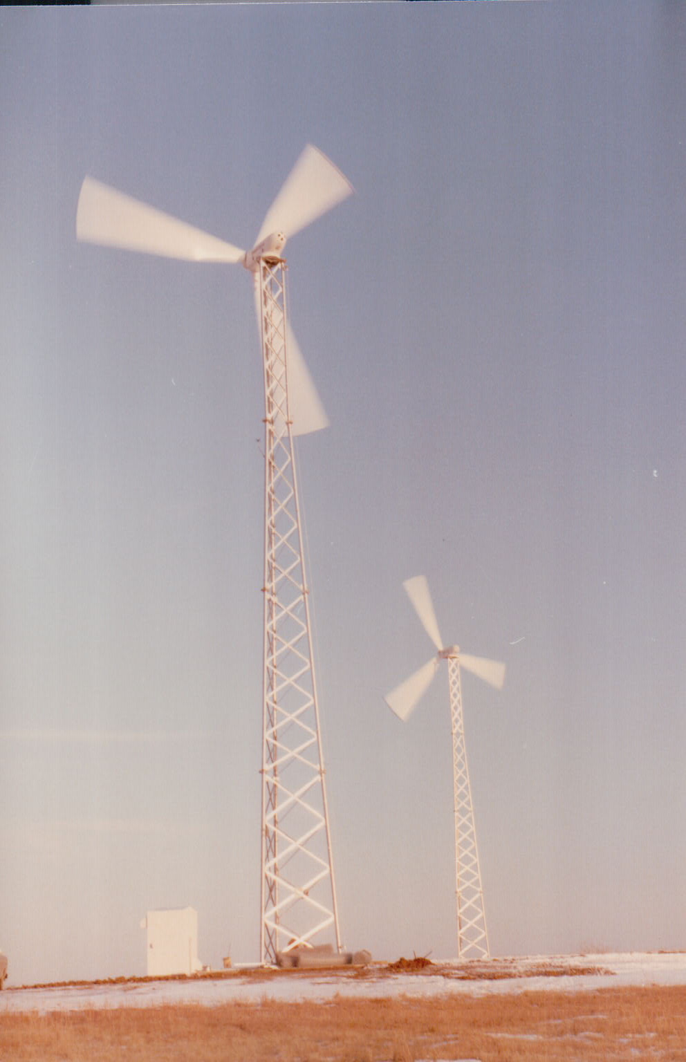 Pictures from the early 1980's of Enertech E44, WindWorker 10, WhirlWind 4000 and Winpower 32 Volt DC.