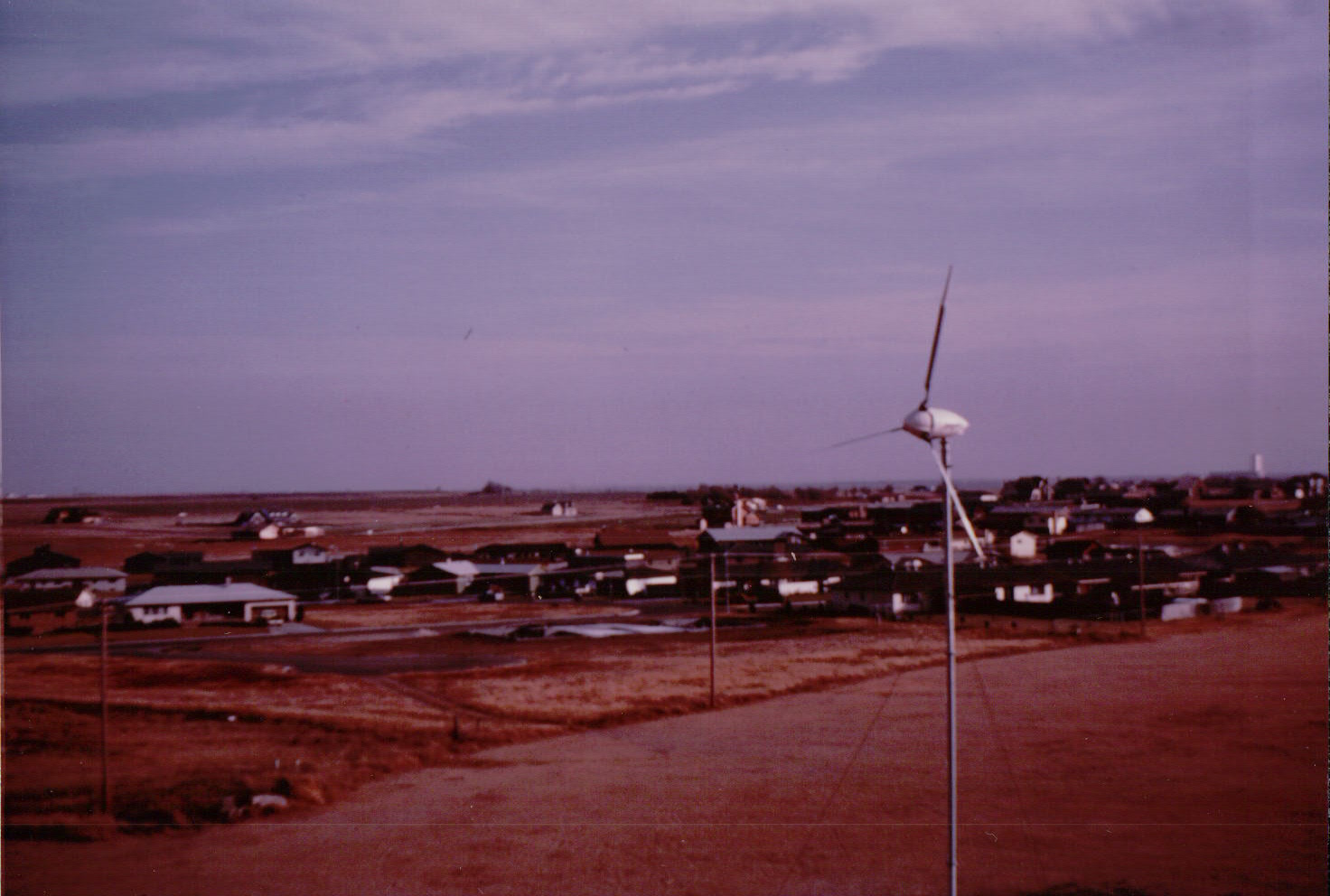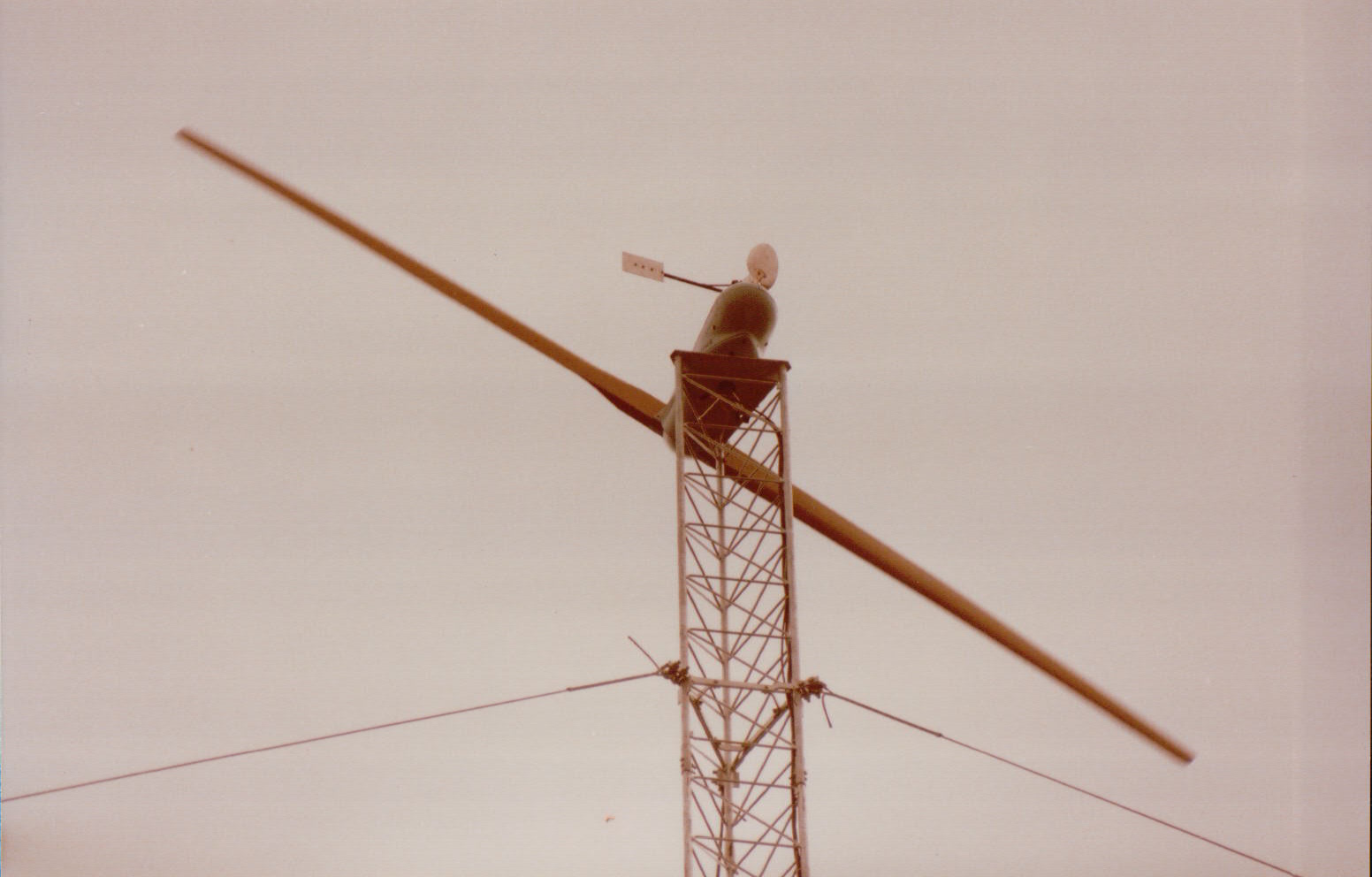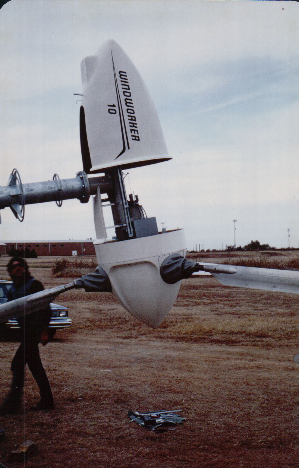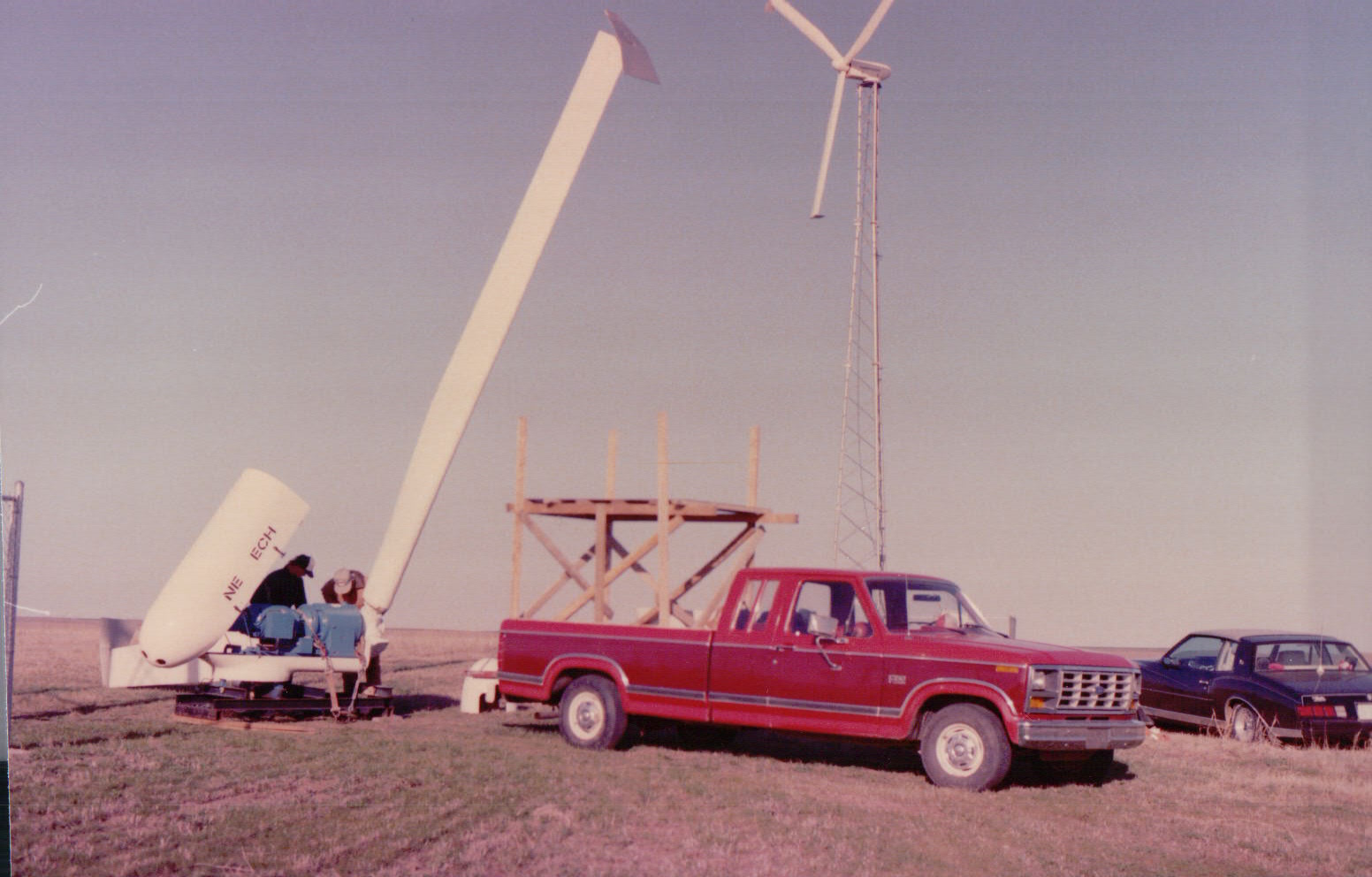 Pictures from the early 1980's of Enertech E44, WindWorker 10, WhirlWind 4000 and Winpower 32 Volt DC.