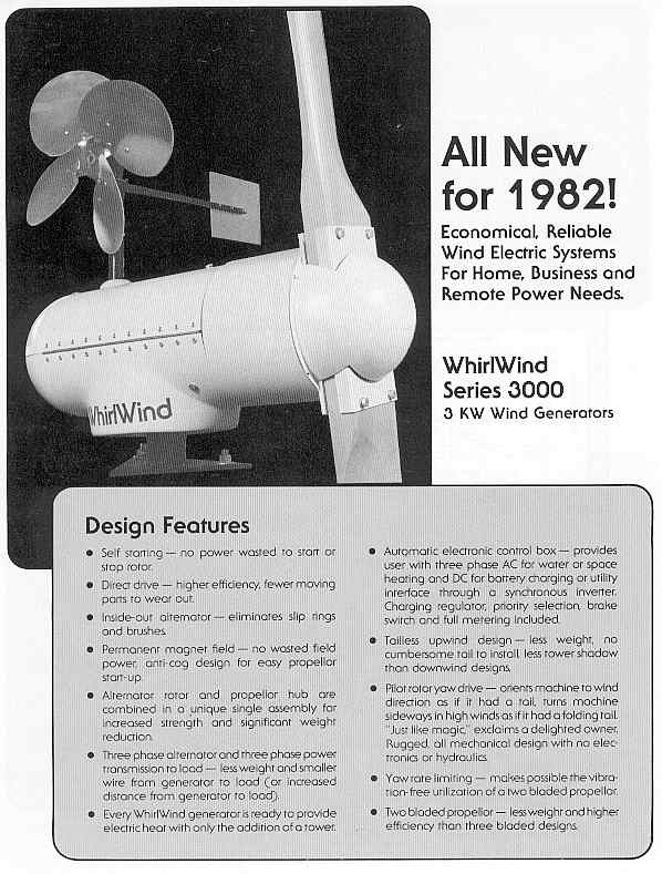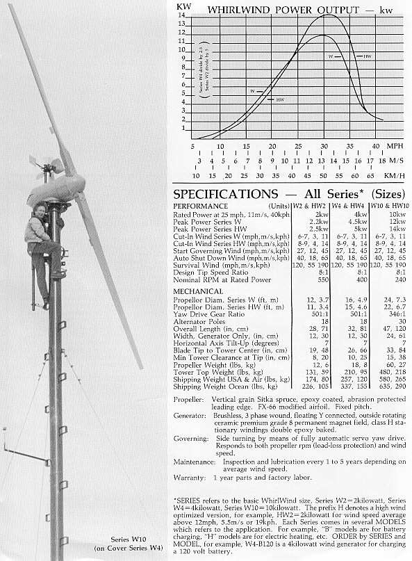 diameter, down wind design-blades act as a tail. Band brake for shut off.